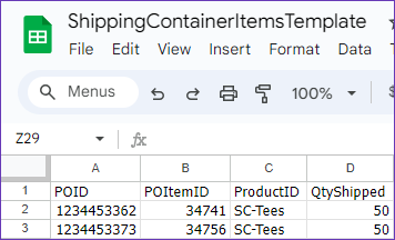- POItemID – The automatically generated line item ID on the PO. You can find it by going to the PO > Toolbox > Items tab. You can also use it to update items in the shipping container.