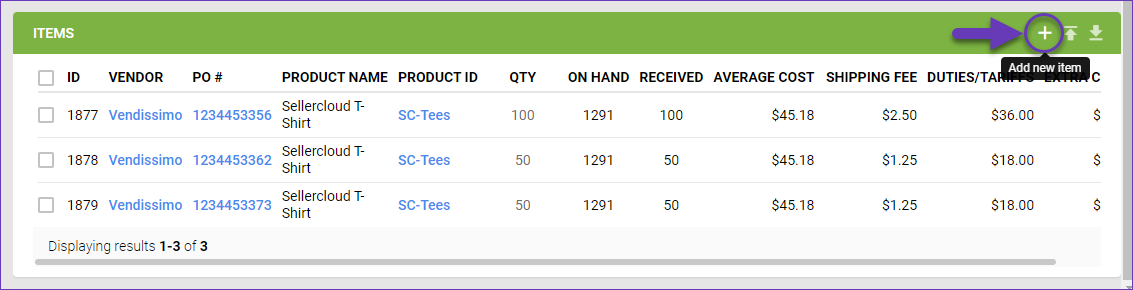- Search for items by SKU. Optionally, you can filter your search by clicking the Add Filter button. You can filter by PO ID, PO Description, or Warehouse.