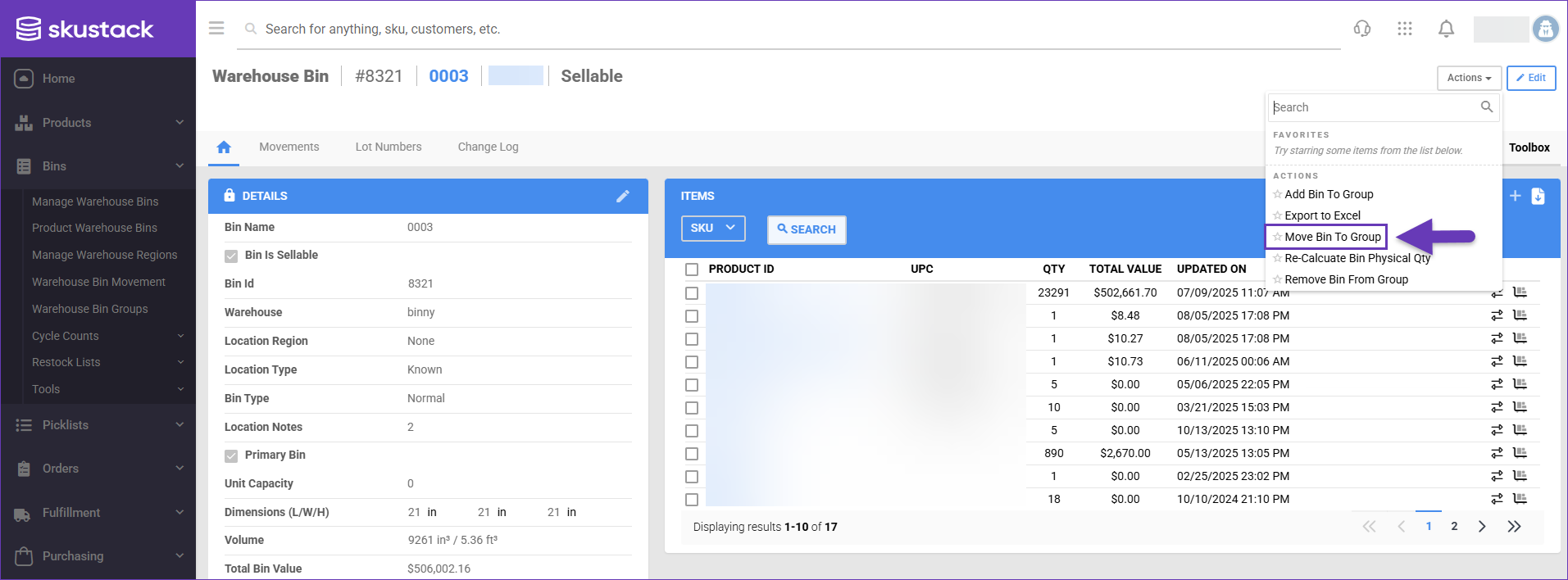 2. From the Actions dropdown, select Move Bin To Group.