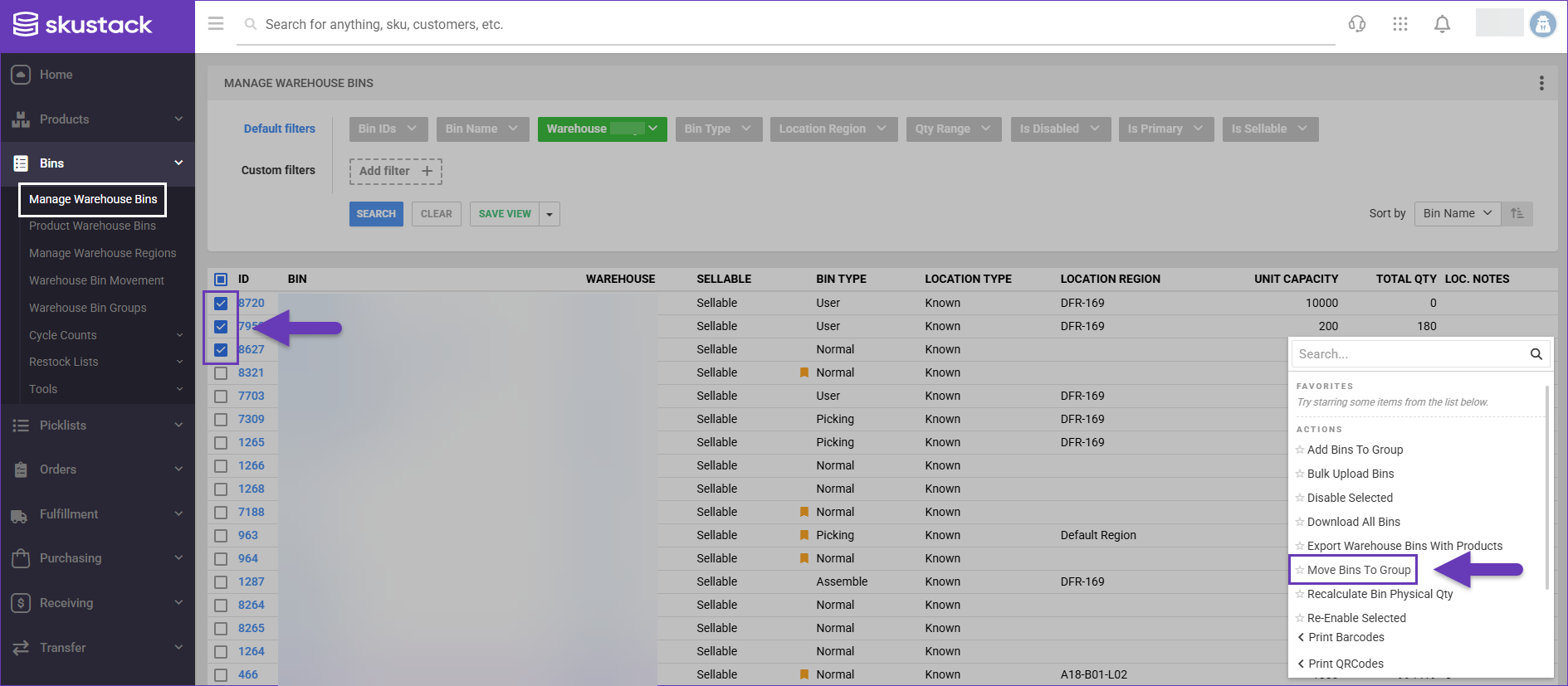 1. Navigate to Bins > Manage Warehouse Bins.