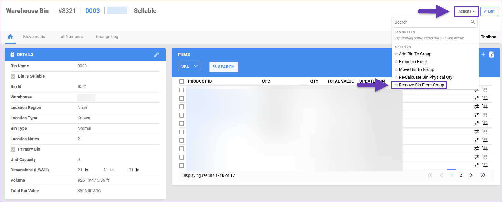 3. Select which Bins to exclude from the group, open the Actions menu and click Remove Bin From Group.
