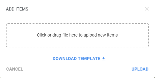 - Add the saved file and click Upload and the products will appear in the Items panel.