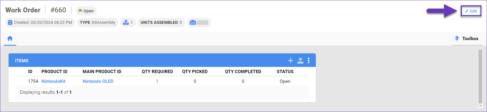 To work on an open Kit Assembly request, navigate to the desired Work Order: